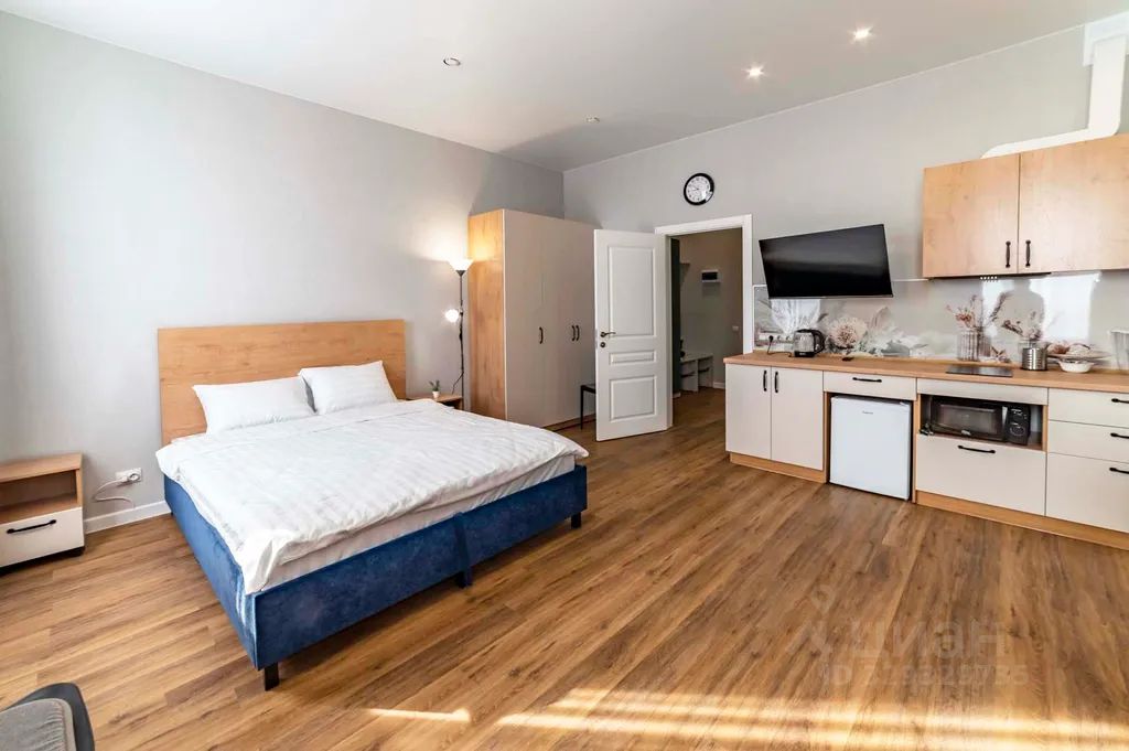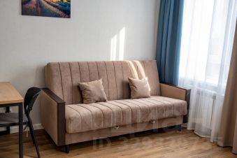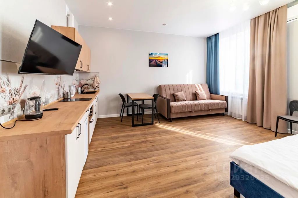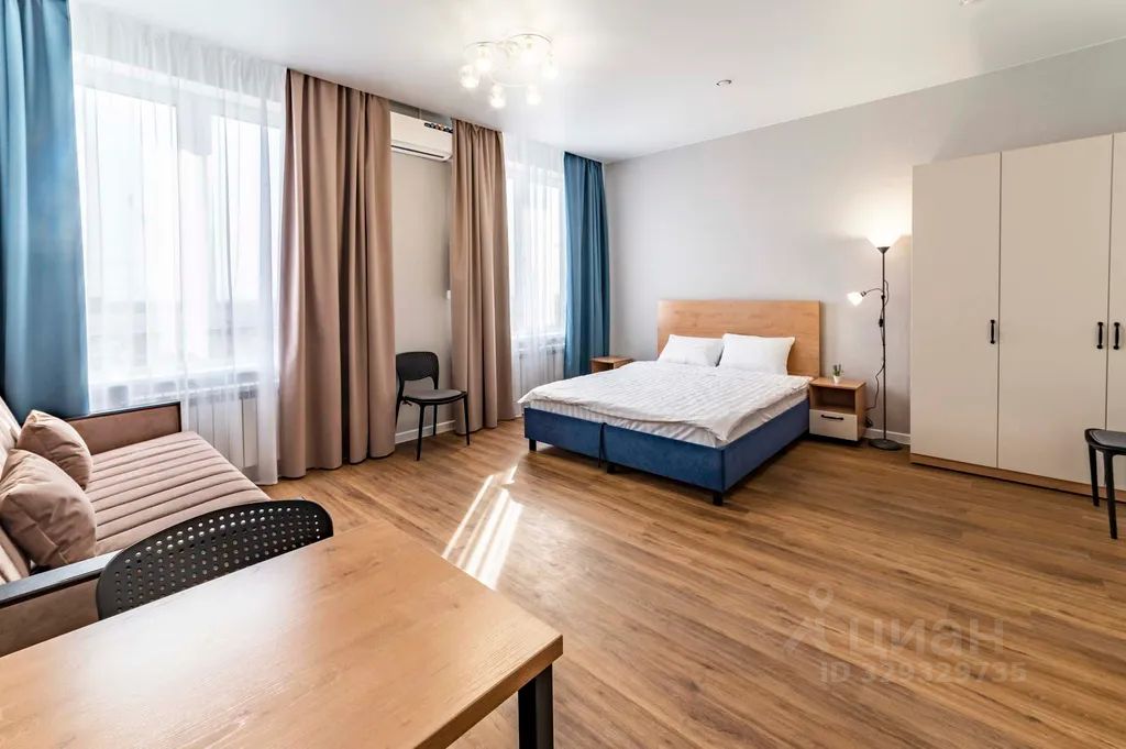 Уютная квартира-студия с двуспальной кроватью и диваном для комфортного отдыха или работы.