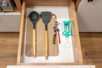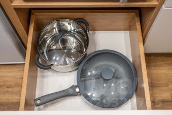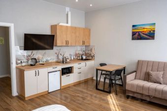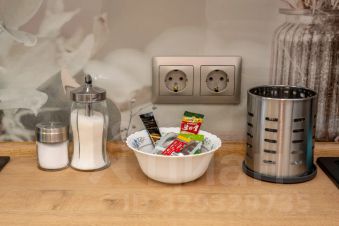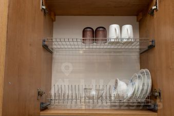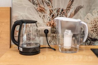 - Кухонная зона оснащённая всей необходимой посудой для сервировки стола, а также бытовыми приборами, включая холодильник, электрочайник, плиту и микроволновую печь, что позволит приготовить любимые блюда.