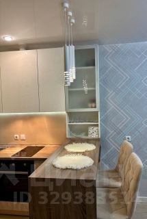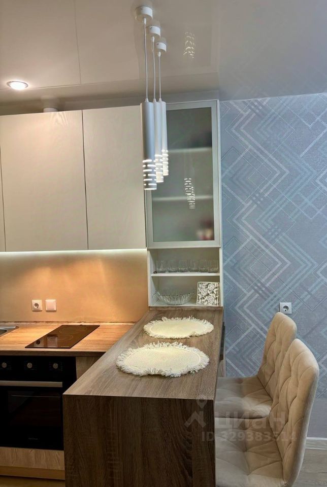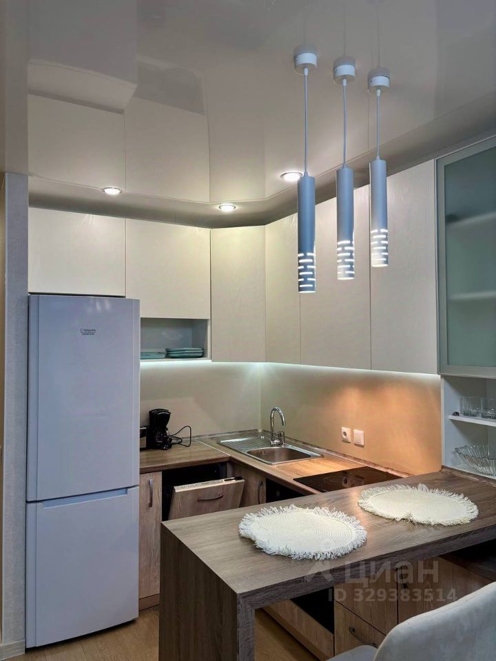 Кухня: Современный кухонный гарнитур со стильной подсветкой рабочей зоны. В наличии вся необходимая встроенная техника: варочная панель, вместительный холодильник Hotpoint Ariston и посудомоечная машина. Обеденная зона реализована в виде красивой барной стойки с мягкими стульями и дизайнерскими подвесными светильниками.