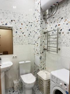 В ванной комнате стиральная машина, водонагреватель, полотенцесушитель , ванна, раковина и подвесной шкафчик с зеркалом, бельевой ящик, а также есть утюг и гладильная доска.