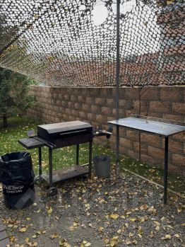Есть место отдыха на улице на закрытой территории с мангалом (решетки, шампура).
