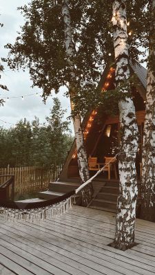 Уютный А-frame Шалаш и Гамак открыл двери для своих гостей. Пожить в доме шалаше захочет каждый, просто потому что шалаш это откуда-то из счастливого беззаботного детства. Если вы любите уединение, тихий спокойный отдых в окружении березового леса то вы влюбитесь в это место. В доме продумано все до мелочей. Панорамные окна с видом на террасу и березовый лес. Прекрасное место что бы отметить знаменательное событие, романтический вечер или отдыха семьей.