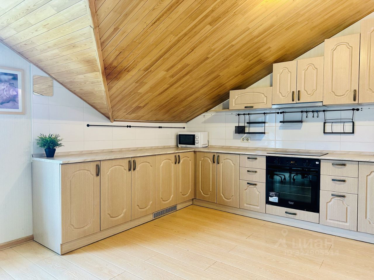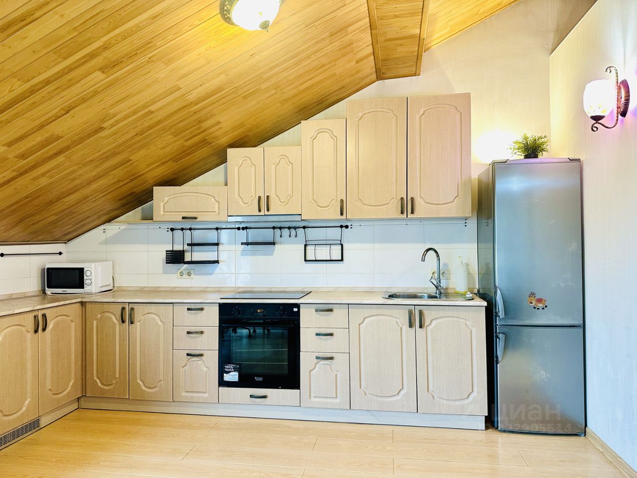 Большая угловая кухня укомплектована всем необходимым: холодильник, духовой шкаф, варочная панель, микроволновка.