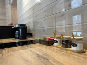 - кухня-гостиная 24 м² с двуспальным раскладным диваном, телевизором диагональю 55 дюймов со Smart-TV, кондиционером, кухней, встроенной СВЧ, вместительным холодильником с морозильной камерой, электрическим чайником и кофеваркой, необходимой посудой и столовыми приборами