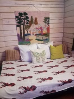 В доме : большая веранда, кухня - гостиная с камином на дровах, спальня, детская.