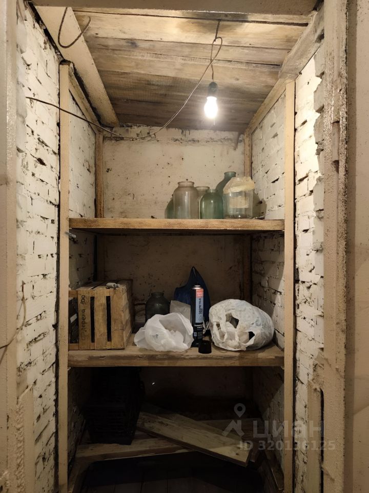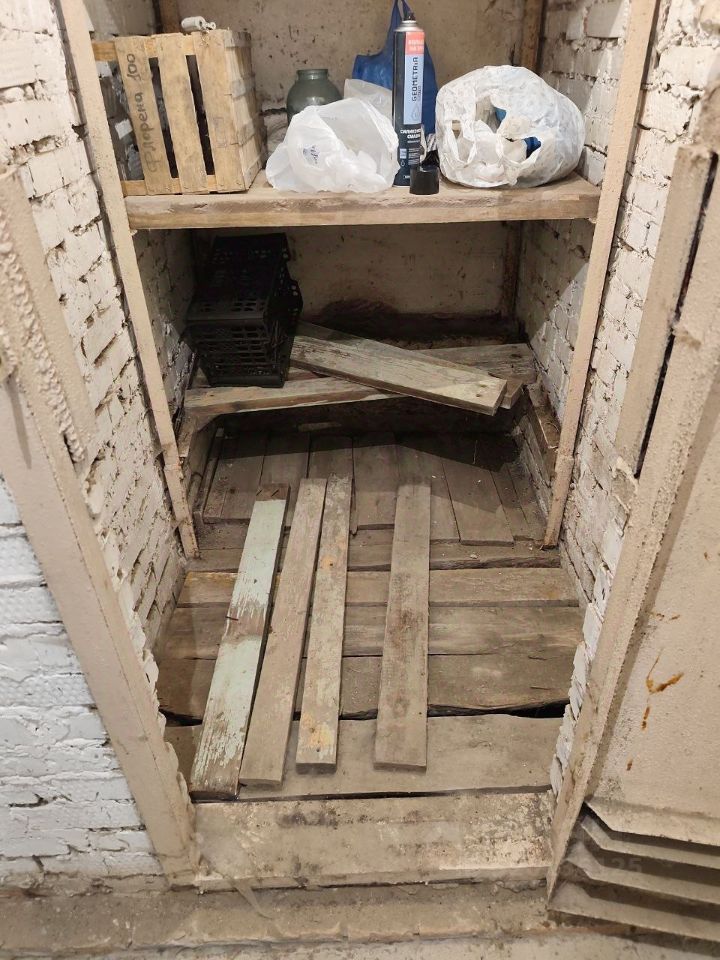 Кабинка сухая, не промерзает. Есть стеллаж для банок (солений) и яма для хранения картошки.