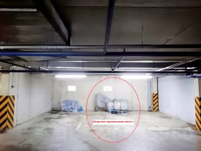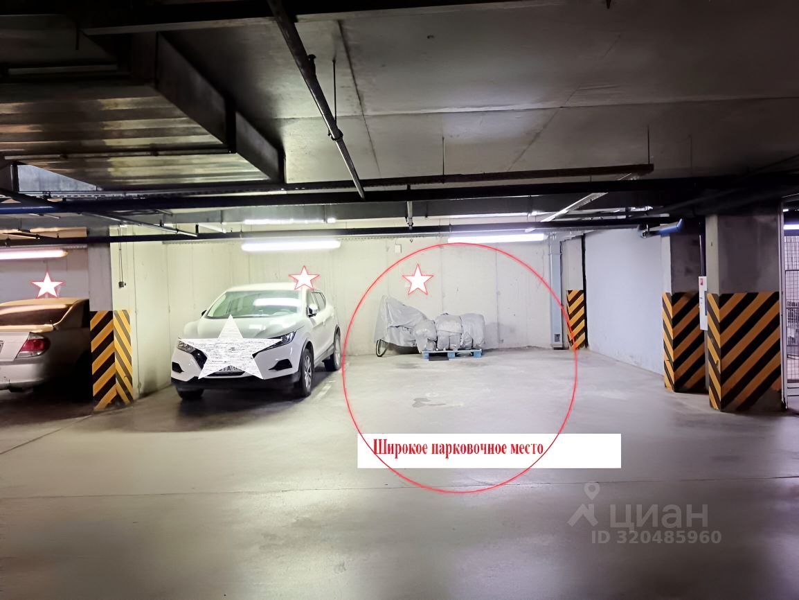 Парковочное место — в центре помещения парковки, в отсеке на две машины, широкое, больше стандартных машиномест.
