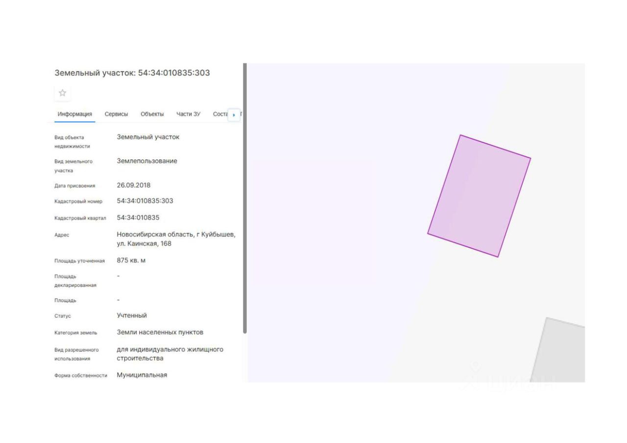 Земельный участок с кадастровым номером 54:34:010835:303 площадь 875 по адресу Новосибирская область, г Куйбышев, ул. Каинская, 168