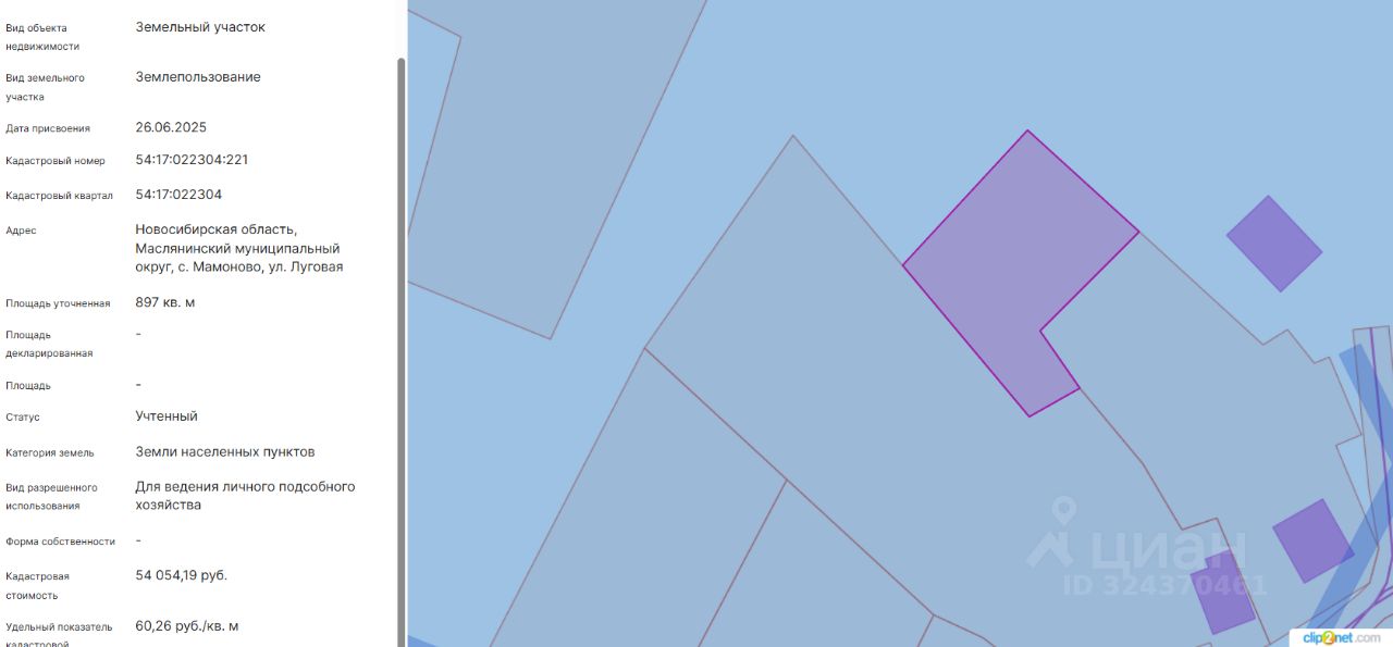 Земельный участок с кадастровым номером 54:17:022304:221 площадь 897 по адресу Новосибирская область, Маслянинский муниципальный округ, с. Мамоново, ул. Луговая