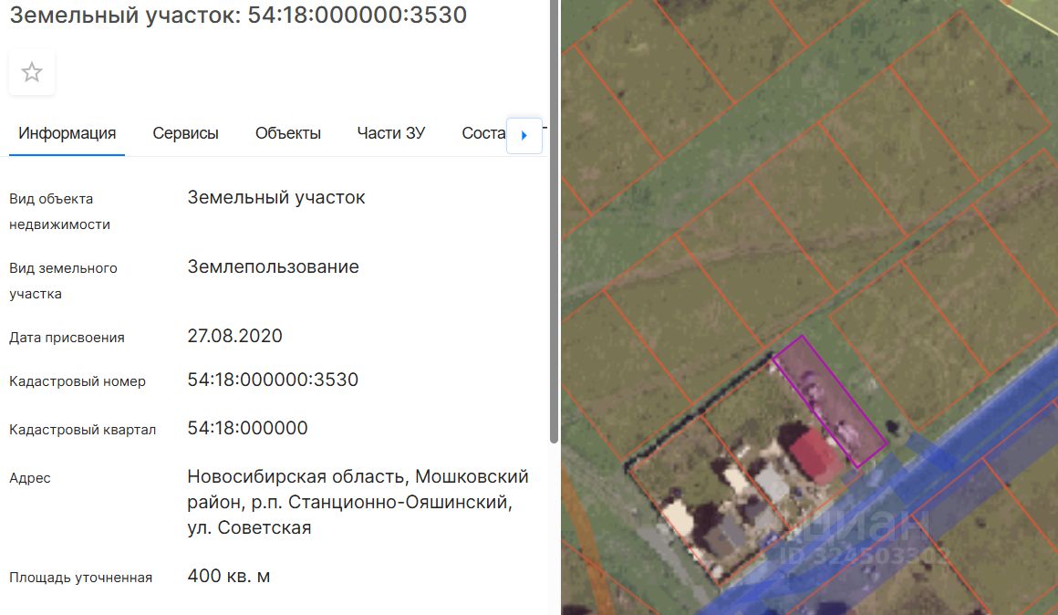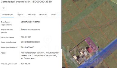 Земельный участок с кадастровым номером 54:18:000000:3530, местоположение: Новосибирская область, Мошковский район, р.п. Станционно-Ояшинский, ул. Советская. Площадь земельного участка 400 кв.м. Категория земель земли населенных пунктов. Разрешенное использование для индивидуального жилищного строительства, ведение садоводства. Обременения, ограничения использования земельного участка земельный участок частично расположен в Охранной зоне "Газоснабжение р.п. Станционно-Ояшинский" Мошковского района Новосибирской области. Площадь покрытия 0 м.кв., Реестровый номер границы: 54:18-6.977