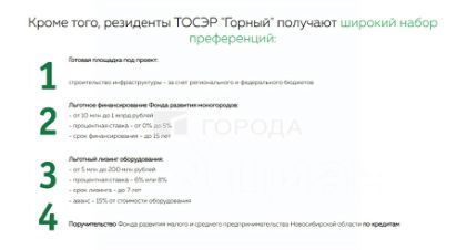 Поселок Горный получил статус территории опережающего социально-экономического развития (ТОР) 12 апреля 2019 года.