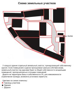 Помещение расположено на огороженной территории производственно-складской базы. Дороги на территории базы в собственности УК, для невозможности ограничения проезда, возможна установка сервитута. Организована охрана, уборка территории, содержание коммуникаций. Отдельное офисное здание на въезде, столовая