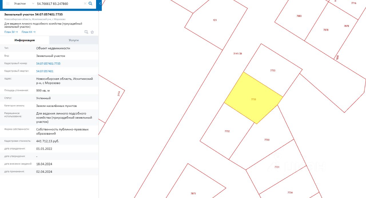 Земельный участок с кадастровым номером 54:07:057401:7735