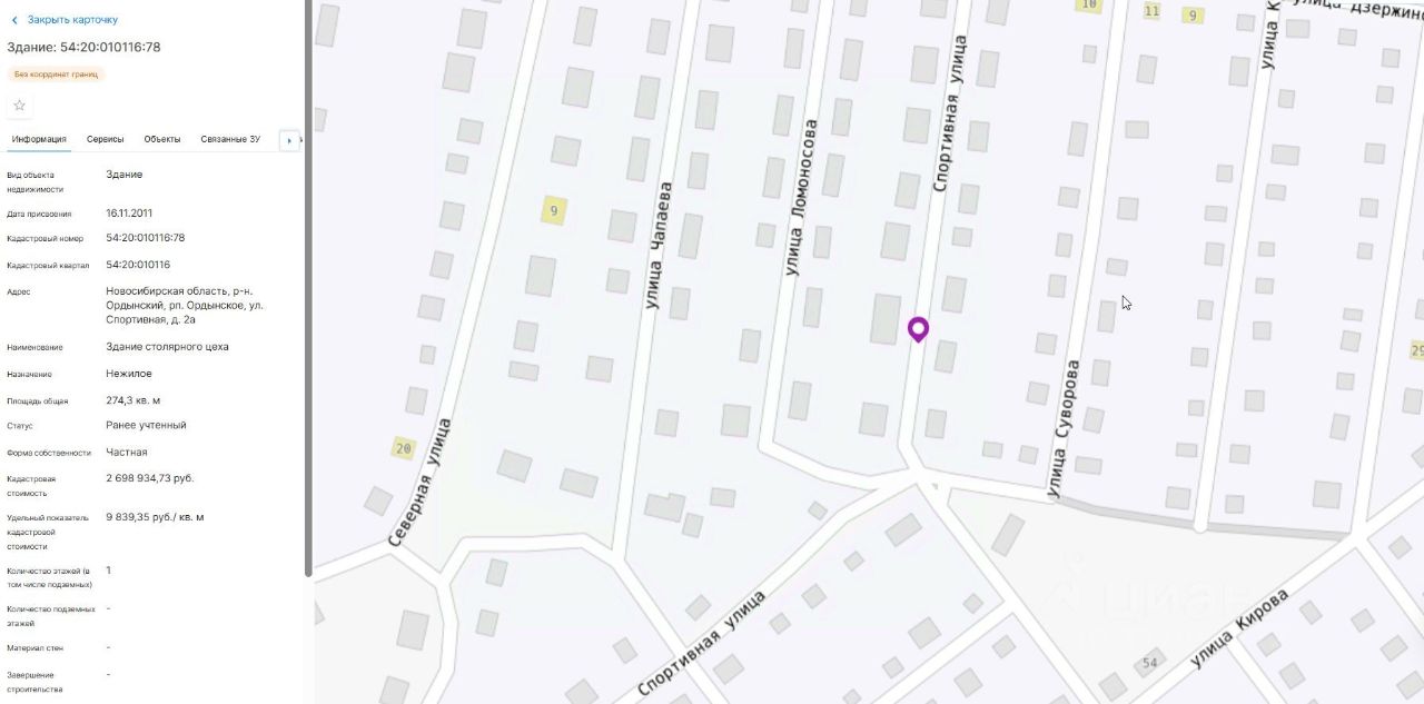 Заместителем начальника отделения - заместителем старшего судебного пристава ОСП по Ордынскому району ГУК ФССП России по Новосибирской области установлено, что площадь здания по выписки ЕГРН и фактическая площадь не соответствует. Данное здание имеет 1 этаж без крыши, верх зашит досками. Материал стен предположительно на момент осмотра - плиты, но не точное описание материала. Обременения: ограничения прав на земельный участок, предусмотренные ст. 56 ЗК РФ (охранная зона объектов электросетевого хозяйства и особых условий установлено бессрочно) (арест)