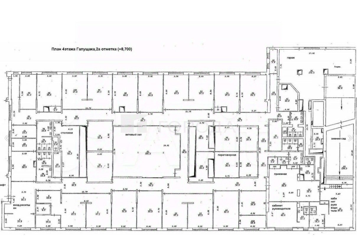 - для первых лиц предприятия выделена зона приемной, из 2-х просторных кабинетов с индивидуальными санузлами, кухней, зимним садом (N23,22,21,25,16,17,20,18,19,24101,104 на плане);