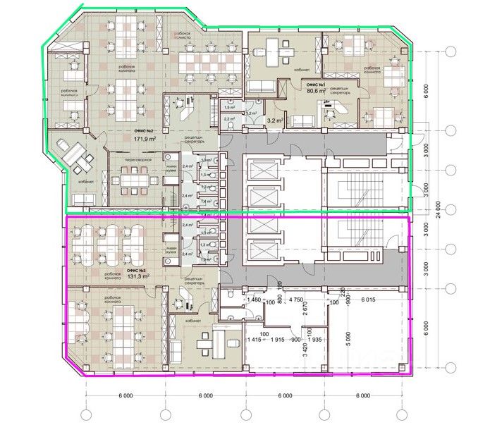 - состоит из 4-х офисных блоков объединенных общим коридором, лифтовым холлом