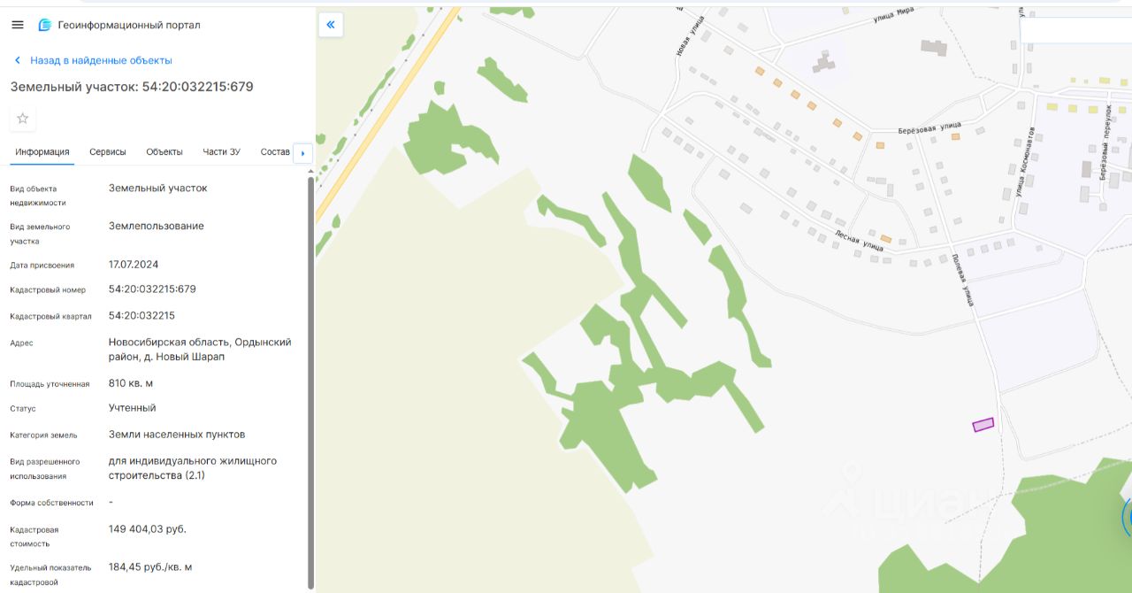 Земельный участок с кадастровым номером 54:20:032215:679 площадь 810 по адресу Новосибирская область, Ордынский район, д. Новый Шарап