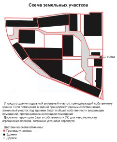 Помещение расположено на огороженной территории производственно-складской базы, но имеет и отдельный выезд. Дороги на территории базы в собственности УК, для невозможности ограничения проезда, возможна установка сервитута. Организована охрана, уборка территории, содержание коммуникаций. Отдельное офисное здание на въезде, столовая