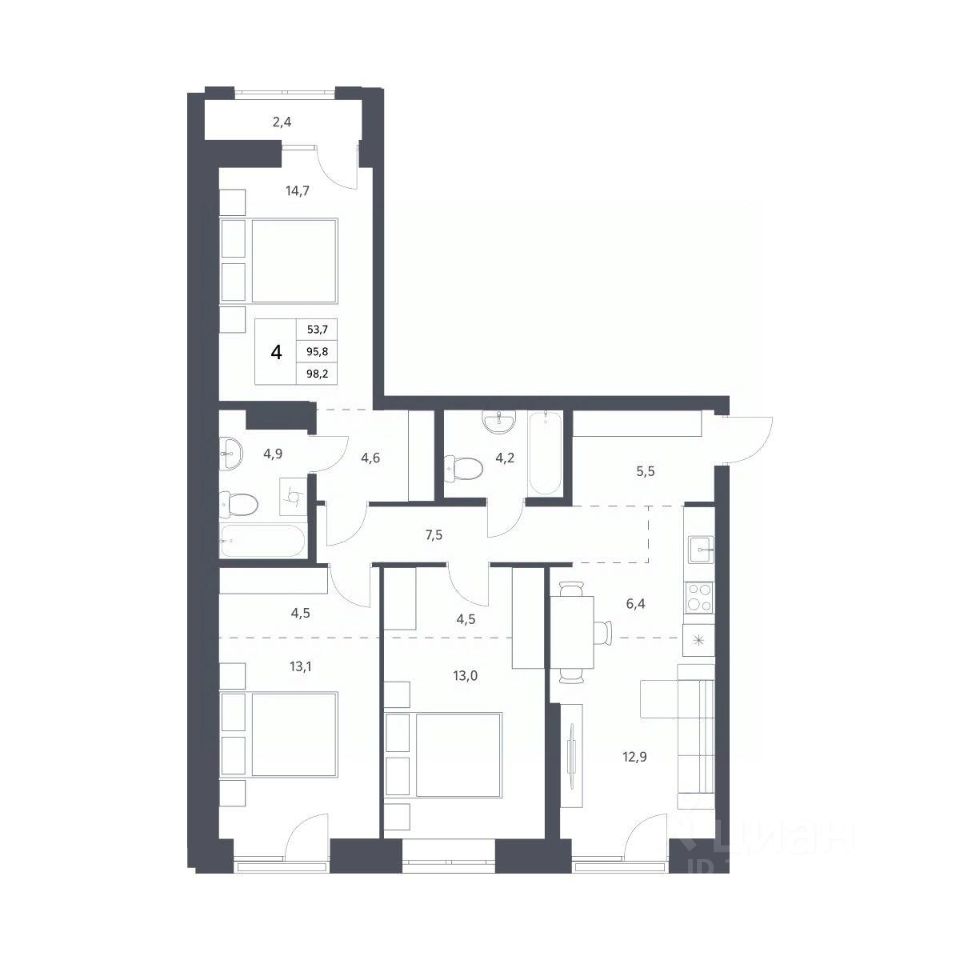 Продается 4-комн. студия с отделкой White box. Квартира расположена на 4 этаже 11 этажного монолитно-кирпичного дома в клубном комплексе "Новаторы" от группы компаний "Поляков".