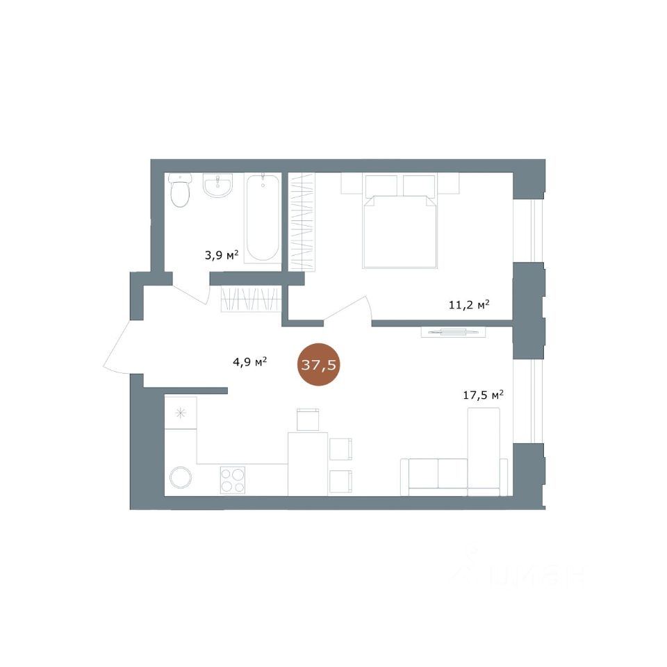 Общая площадь37,5 м²