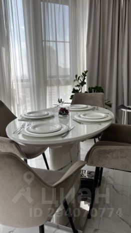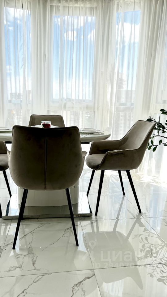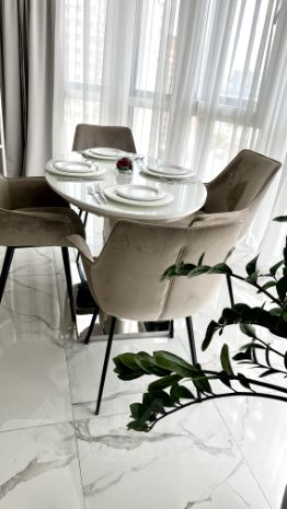 Светлая столовая зона с видом на город и теплым полом.
