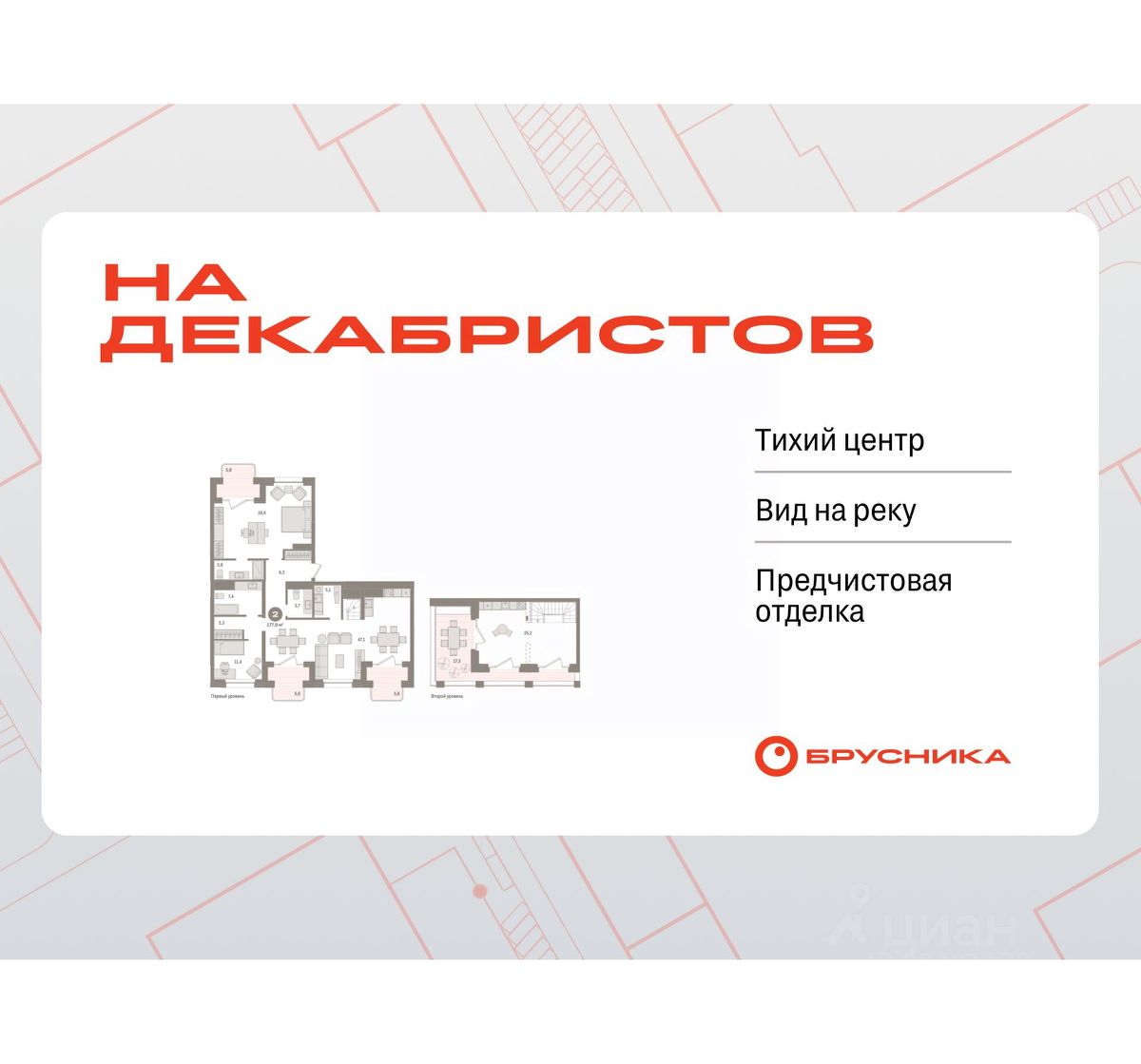 Продается 2-комн. квартира с предчистовой отделкой в Квартал На Декабристов на 7 этаже. Двухуровневая квартира, множество вариантов распределения полезного пространства. Общая площадь: 177.94 кв.м., жилая: 40 кв.м., площадь просторной кухни-гостиной: 47.1 кв.м. Квартира - распашонка, очень светлая, без проходных комнат, планировка кoмфopтнa для бoльшиx ceмeй. В квартире три балкона, два совмещенных и один раздельный санузел. Терраса представляет собой роскошную зону отдыха для проведение вечеров в кругу семьи и друзей или организация вечеринок. Высота потолков 2.81 м.