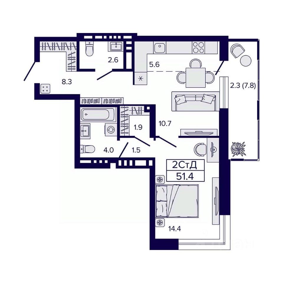 Общая площадь51,4 м²