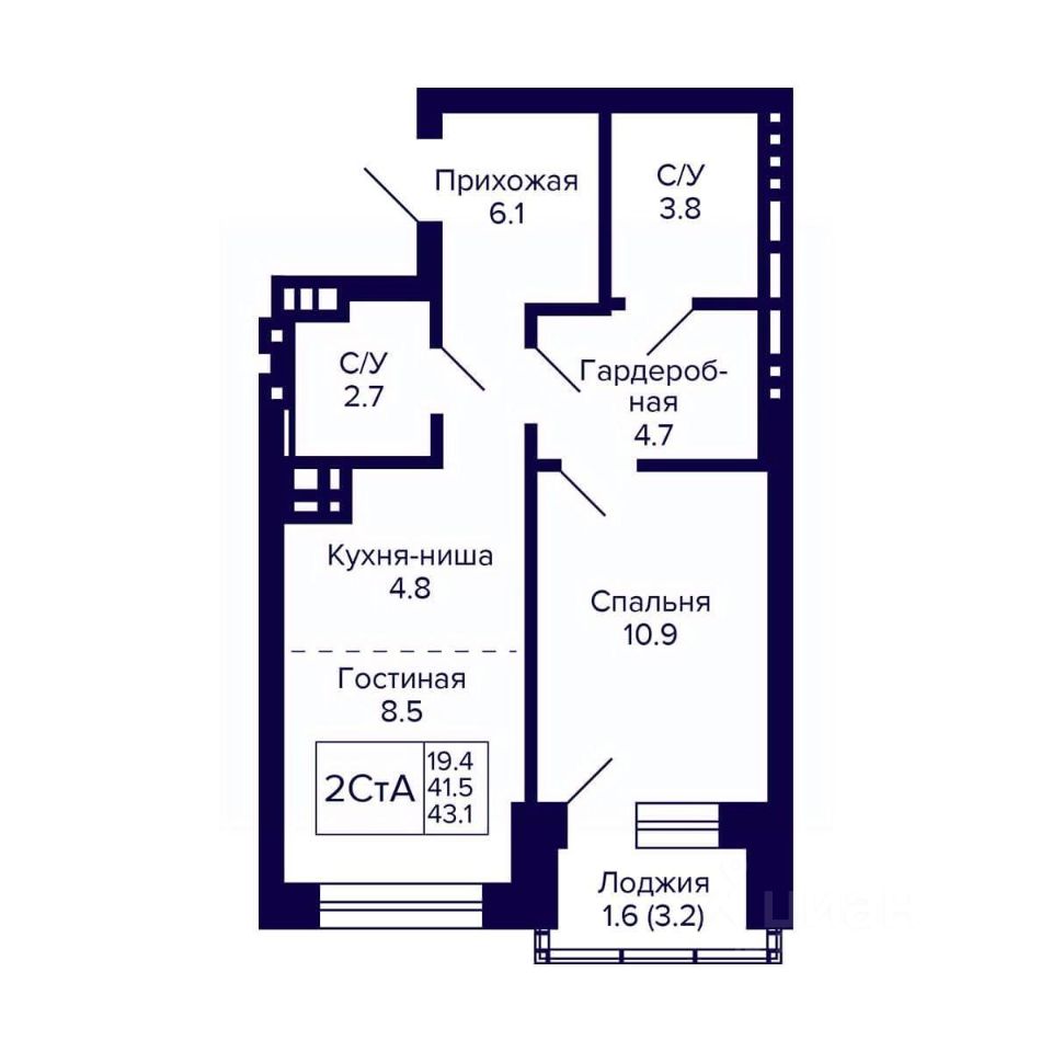 Общая площадь43,1 м²