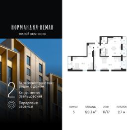 Трехкомнатная студия с предчистовой отделкой в ЖК "Нормандия - Неман" на 17 этаже. Общая площадь: 120.3 кв.м., жилая: 89 кв.м., суммарная площадь гостиной-столовой с кухонной зоной: 28.4 кв.м. Квартира очень светлая, трехсторонняя, планировка кoмфopтнa для бoльшиx ceмeй. В квартире четыре балкона, один совмещенный и один раздельный санузел. Высота потолков 2.7 м.