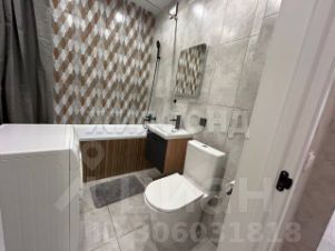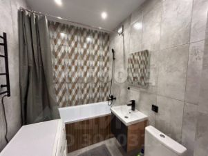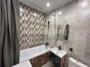 Ванная комната облицована кафельной плиткой, включая экран под ванной. Также в ванной есть хороший унитаз, смесители, зеркало с подсветкой и электрический полотенцесушитель. На просторной лоджии постелен ковролин.