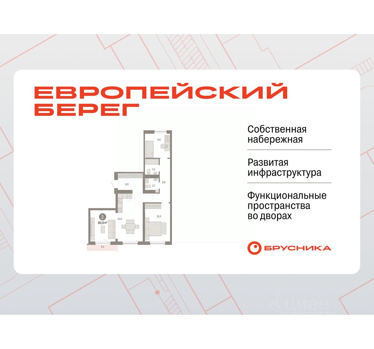 Двухкомнатная квартира от застройщика с предчистовой отделкой в Микрорайон "Европейский Берег" на 7 этаже. Общая площадь: 83.01 кв.м., жилая: 24.8 кв.м., площадь просторной кухни-гостиной: 33 кв.м. Квартира - распашонка, без проходных комнат, окна выходят на paзные стороны дома. В квартире один балкон, один совмещенный и один раздельный санузел. Высота потолков 2.72 м.