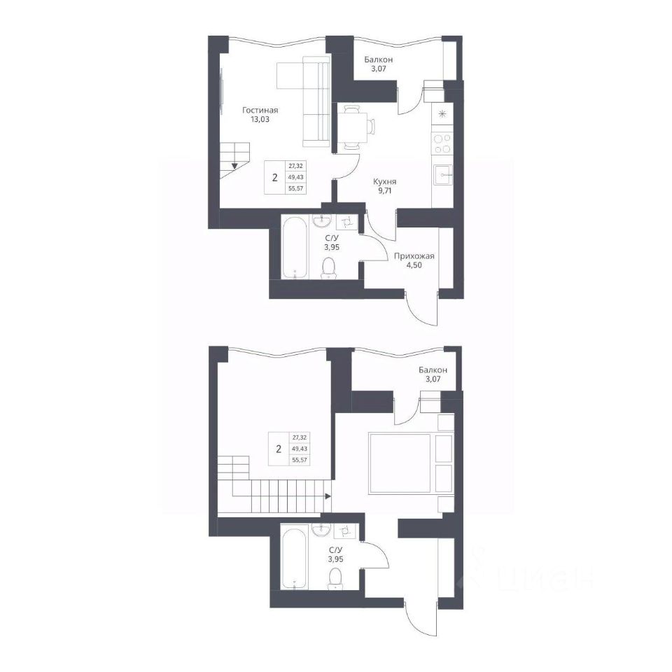 Продается 2-комн. студия с отделкой White box. Квартира расположена на 2 этаже 24 этажного монолитно-кирпичного дома в Акцентном доме "Актив" от группы компаний "Поляков".