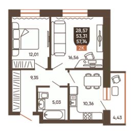 Общая площадь57,74 м²