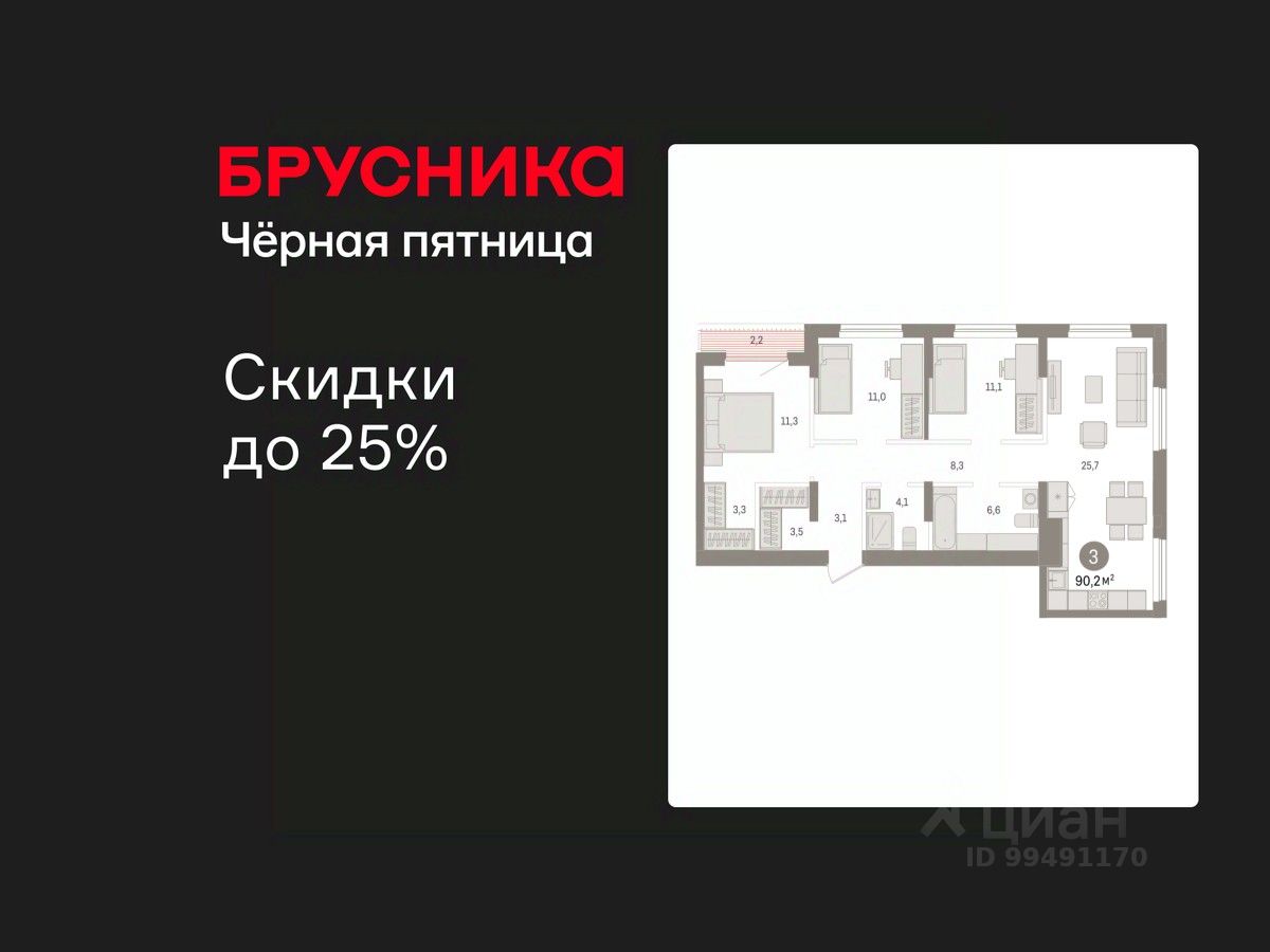 Квартира с кухней-гостиной и тремя спальнями в квартале Авиатор. Особенности планировки: второй санузел, гардеробная, свободная планировка, мастер-спальня, терраса на крыше.
