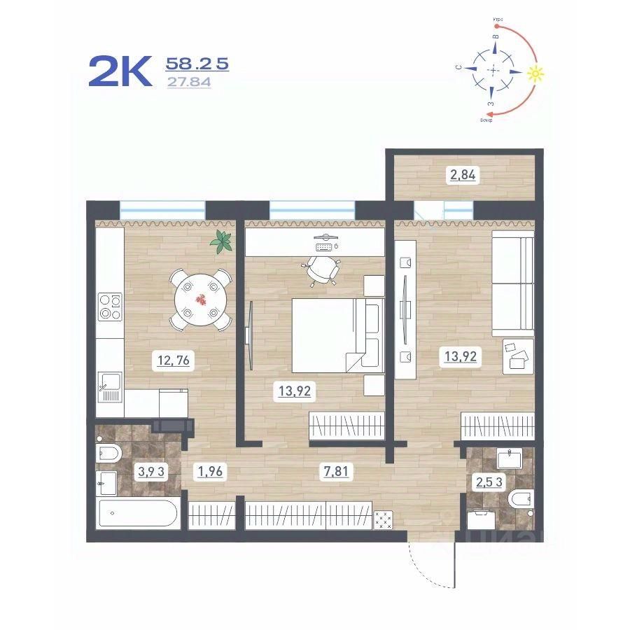 Продаётся 2-комнатная квартира в строящемся доме (Дом 10), срок сдачи: IV-кв. 2025, общей площадью 58.25 кв.м., на 2 этаже. Расположение, транспортная доступность