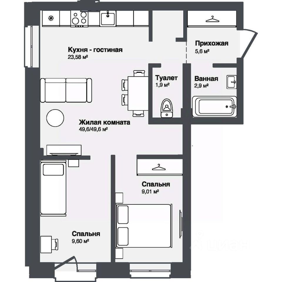 Общая площадь49,6 м²