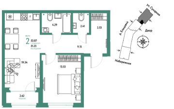 Продается 2комнатная квартира на 13 этаже от застройщика Страна Девелопмент. Площадь квартиры 53,87 кв. м.