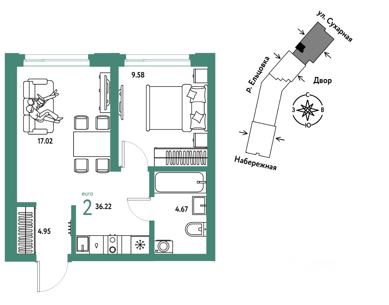 Продается 2комнатная квартира на 25 этаже от застройщика Страна Девелопмент. Площадь квартиры 36,22 кв. м.