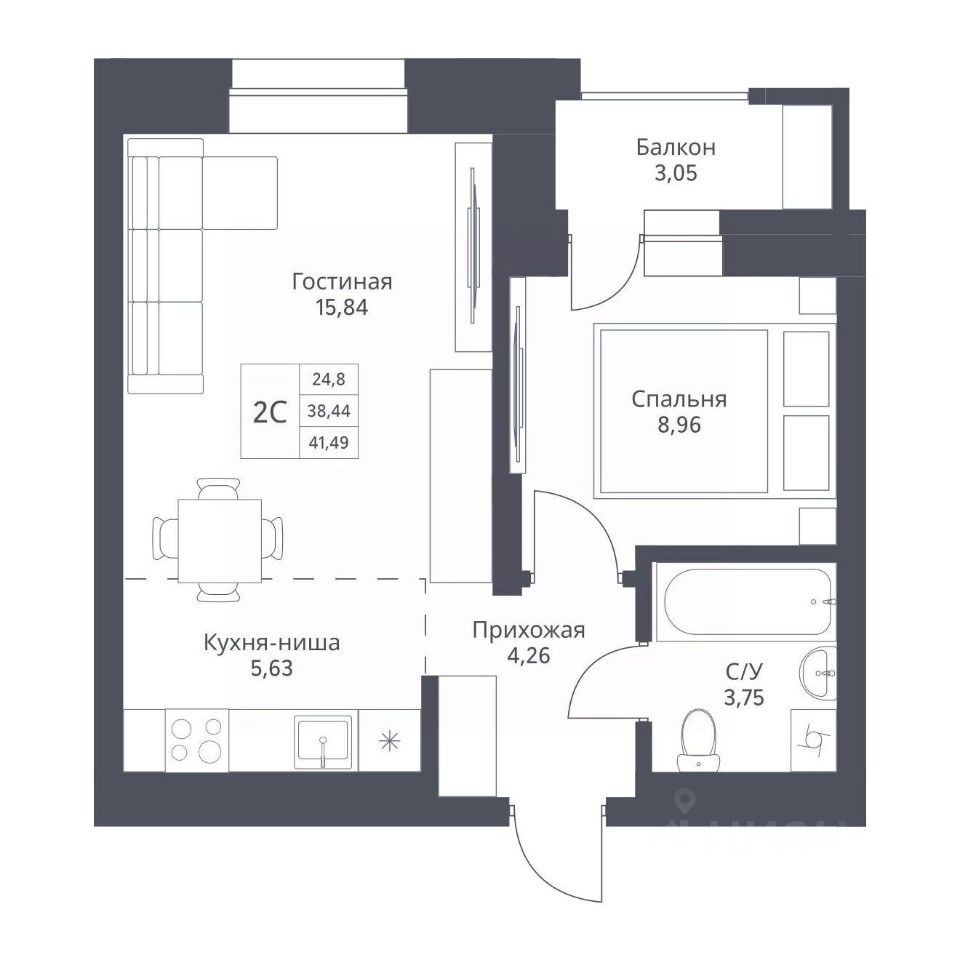Продается 2-комн. студия с отделкой White box. Квартира расположена на 2 этаже 24 этажного монолитно-кирпичного дома в Акцентном доме "Актив" от группы компаний "Поляков".