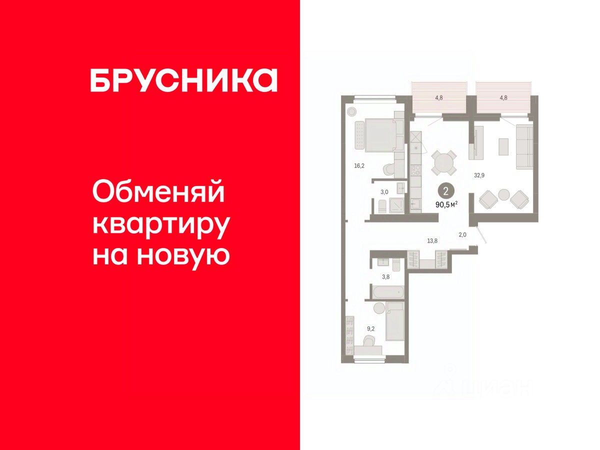 Квартира с кухней-гостиной и двумя спальнями в квартале "Лебедевский". Особенности планировки: балкон, окна на две стороны, предчистовая отделка, разнесённые спальни.