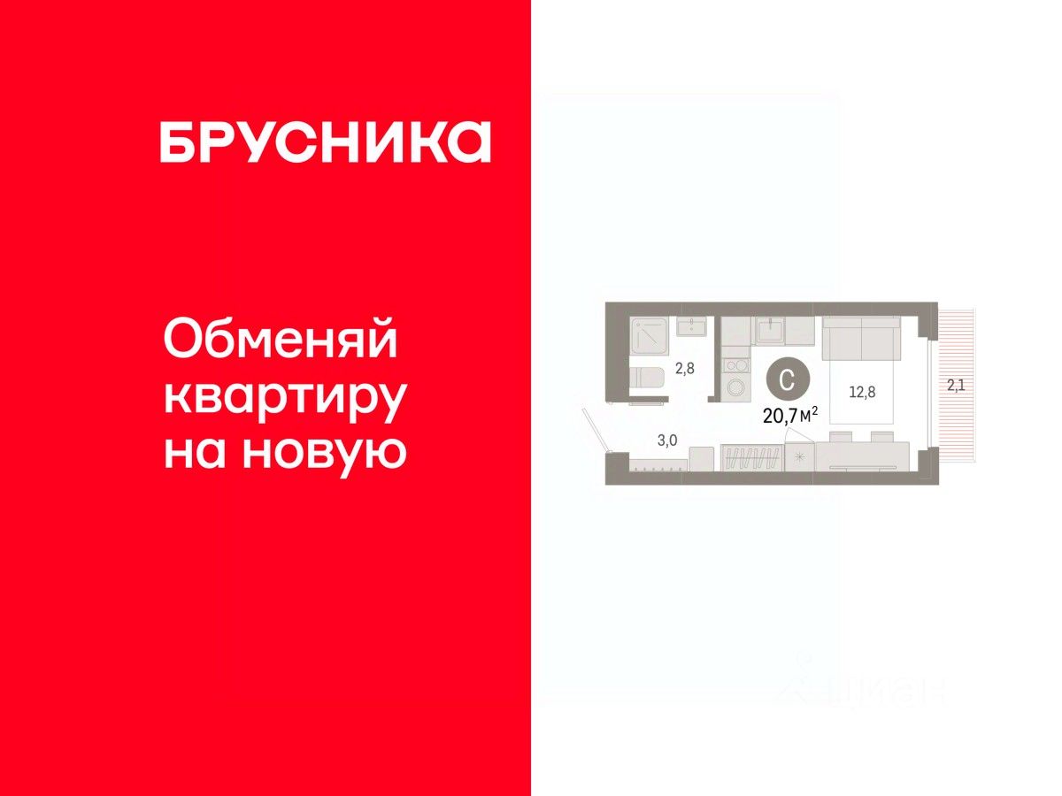 Студия в квартале "Лебедевский". Особенности планировки: балкон, предчистовая отделка.