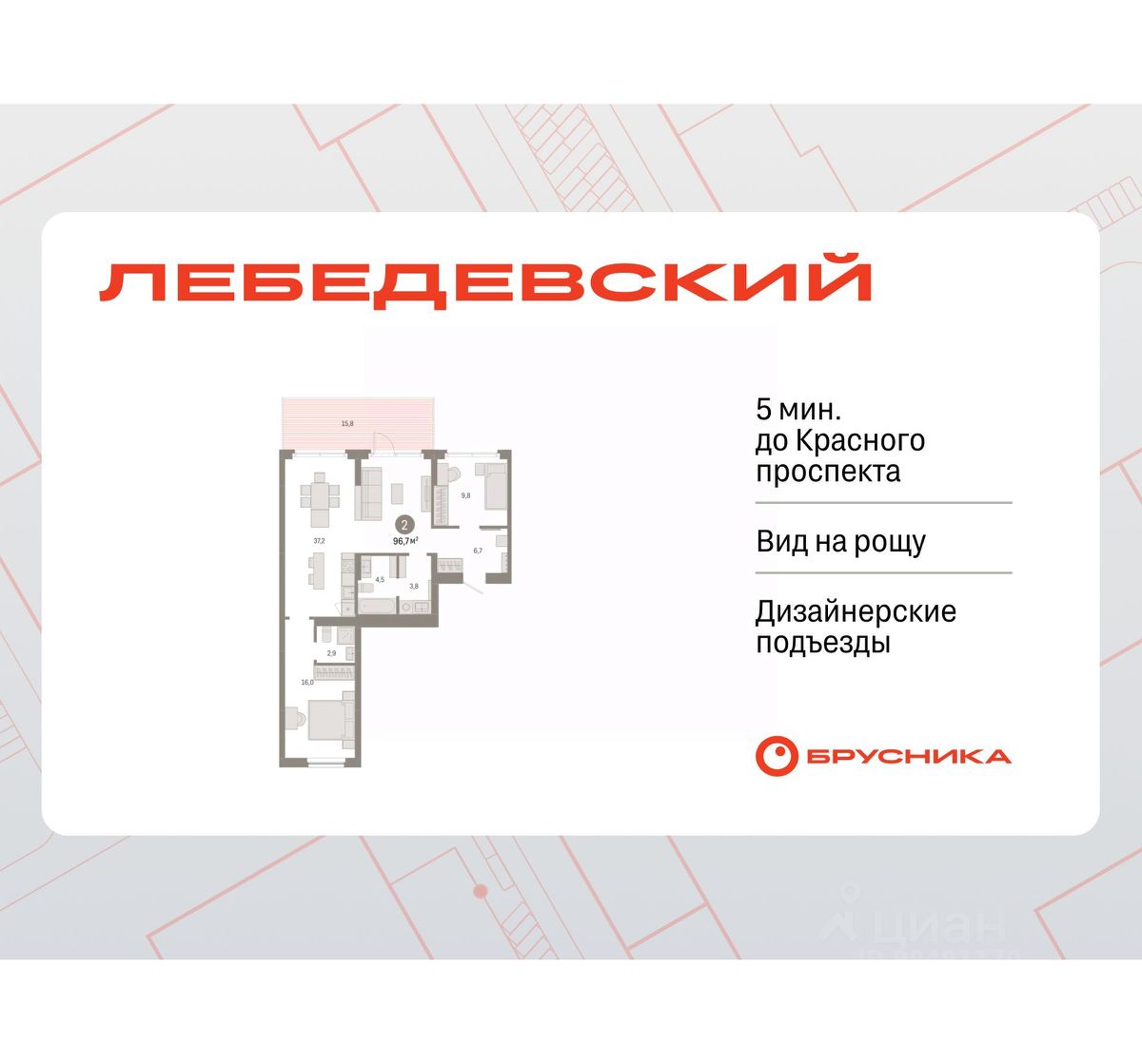 2-комн. квартира с предчистовой отделкой в ЖК "Лебедевский" на 2 этаже. Общая площадь: 96.7 кв.м., жилая: 25.8 кв.м., площадь просторной кухни-гостиной: 37.2 кв.м. Квартира - распашонка, без проходных комнат, окна выходят на paзные стороны дома. В квартире один балкон, два совмещенных санузла. Терраса представляет собой роскошную зону отдыха для проведение вечеров в кругу семьи и друзей или организация вечеринок. Высота потолков 2.82 м.