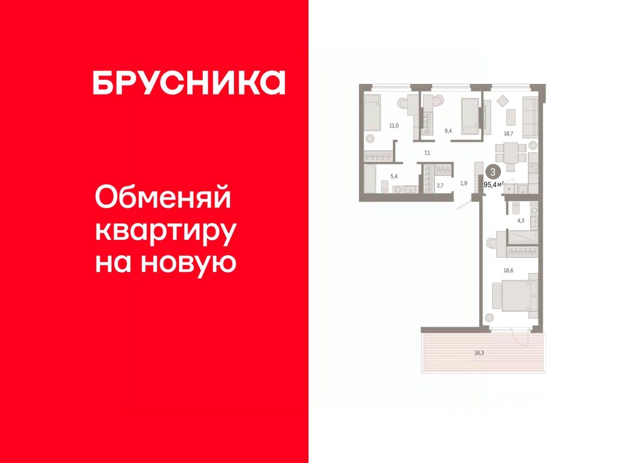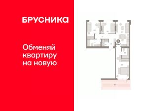 Квартира с кухней-гостиной и тремя спальнями в квартале "Лебедевский". Особенности планировки: мастер-спальня, окна на две стороны, предчистовая отделка.