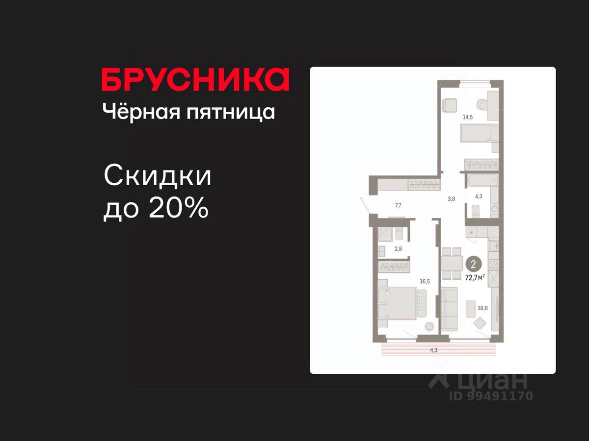 Квартира с кухней-гостиной и двумя спальнями в квартале "Лебедевский". Особенности планировки: окна на две стороны, разнесённые спальни, предчистовая отделка, мастер-спальня, балкон.