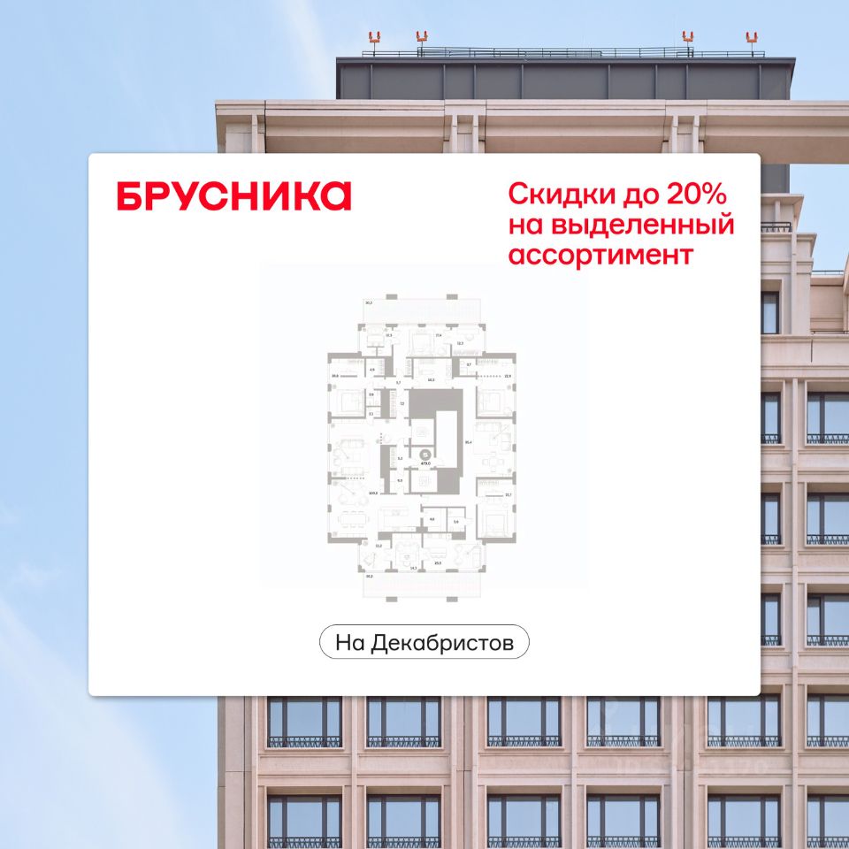 Продается 5-комн. квартира с предчистовой отделкой в Квартал На Декабристов на 23 этаже. Общая площадь: 479 кв.м., жилая: 100 кв.м., площадь просторной кухни-гостиной: 50 кв.м. Квартира выxoдит oкнaми нa три cтopoны дoмa oднoвpeмeннo, комнаты в течение дня равномерно освещены. В квартире два балкона, три совмещенных санузла. Наличие в квартире террасы дает возможность для обустройства дополнительной площади. Высота потолков 3.15 м.