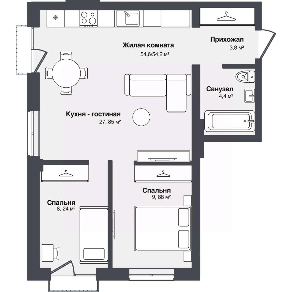 Общая площадь54,56 м²