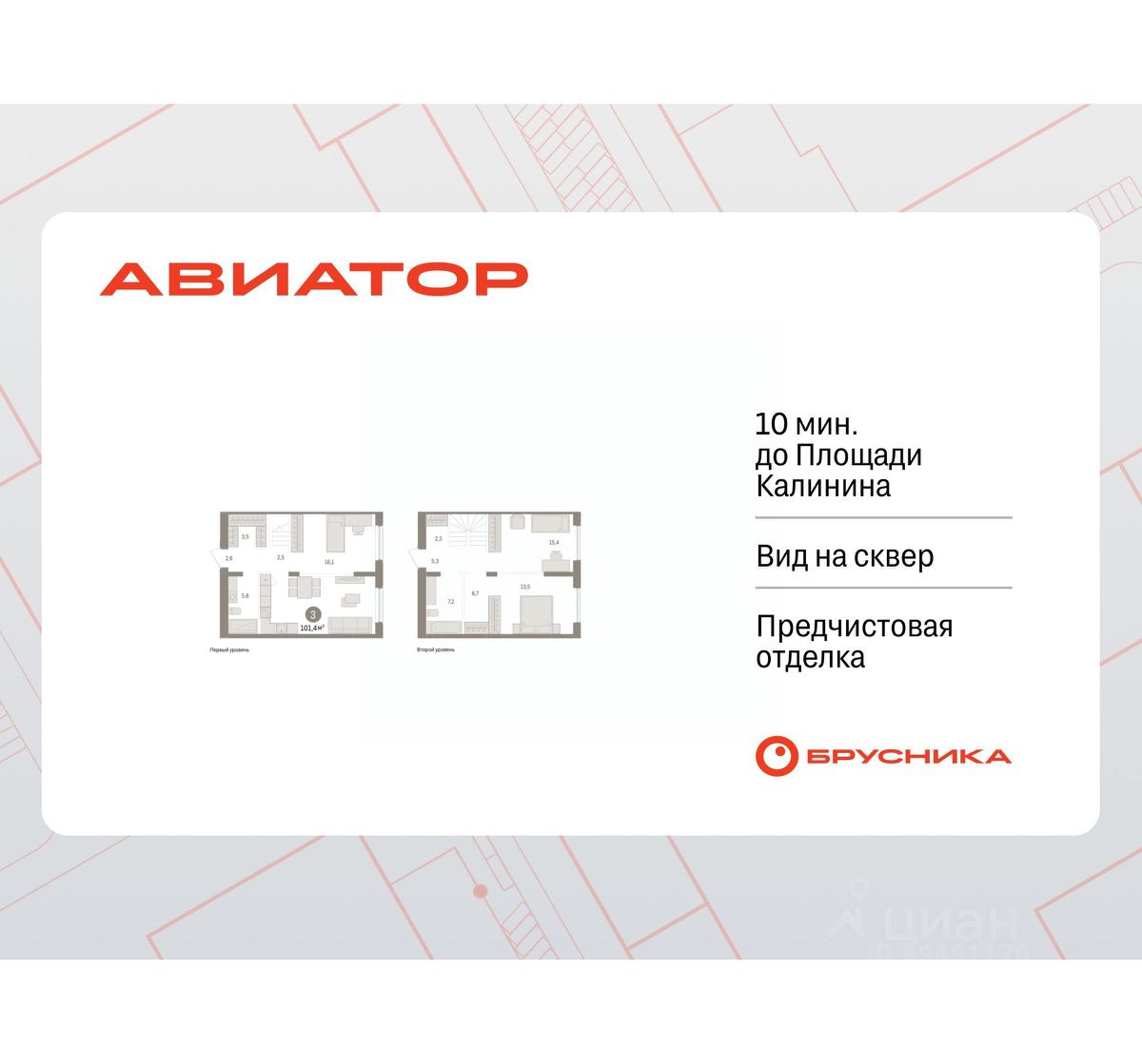 Трехкомнатная квартира с предчистовой отделкой в Квартал "Авиатор" на 15 этаже. Двухуровневая квартира, планировка позволяет организовать индивидуальное пространство для каждого члена семьи. Общая площадь: 101.43 кв.м., жилая: 38.9 кв.м., площадь просторной кухни-гостиной: 16.1 кв.м. Комнаты изолированные, все окна выходят на одну сторону. В квартире два совмещенных санузла. Высота потолков 2.82 м.