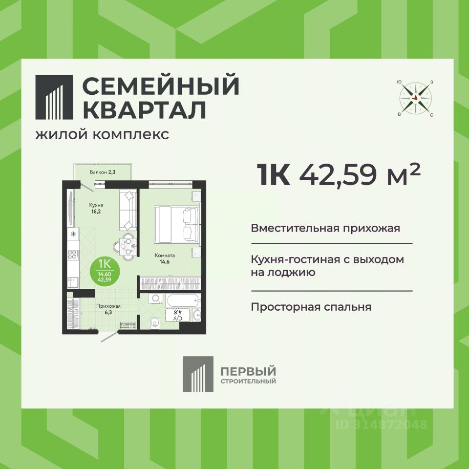 Общая площадь42,59 м²