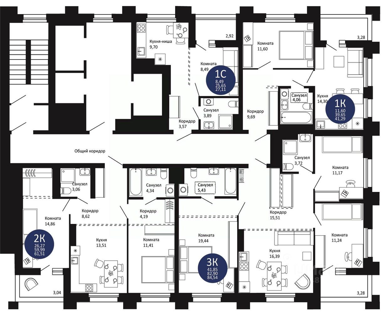 — широкая линейка планировок: от уютных студий до просторных 3К