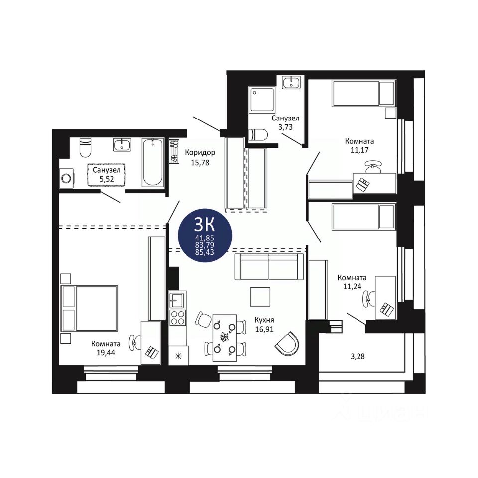 Общая площадь85,43 м²